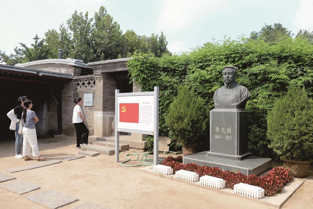 乐亭县大黑坨村李大钊故居院内,参观者在李大钊半身铜像前,驻足凝视,聆听讲解。