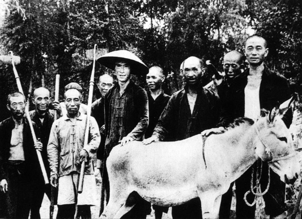 20世纪50年代,在全国农业合作化运动中,遵化县西铺村王国藩(中)带领本村23户贫农创办的初级农业生产合作社,因社里唯一的一头驴,还有四分之一的使用权属于没有入社的村民,又被人们称作“三条驴腿”的“穷棒子社”。(资料)